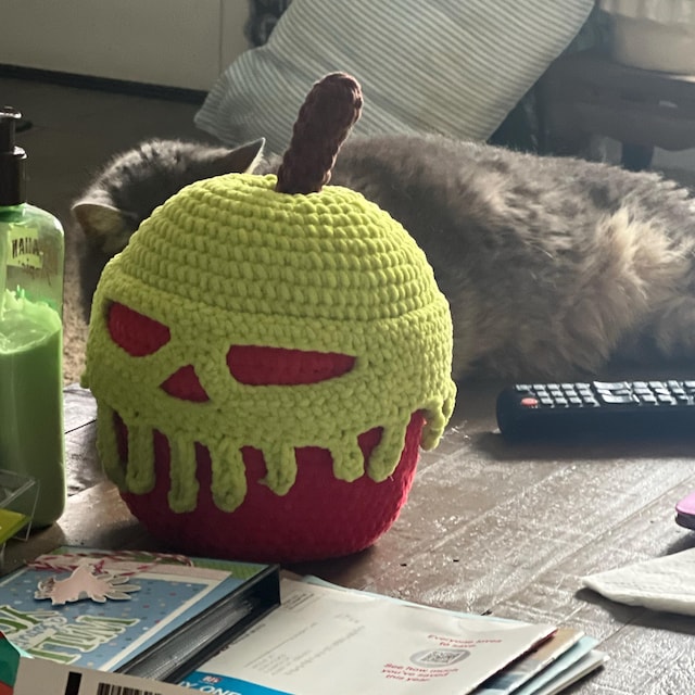 Bring this enchanted poisoned apple into your life and let it add a touch of mystery, magic, and handmade charm. Whether displayed on a shelf, gifted to a loved one, or used as a whimsical seasonal accent, this crochet plush will cast its spell wherever it goes.